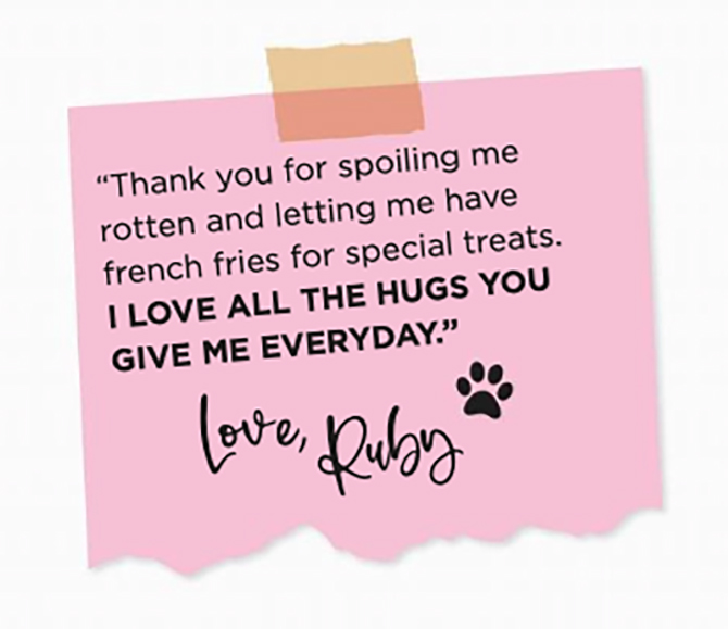 “Thank you for spoiling me rotten and letting me have french fries for special treats. I love all the hugs you give me every day.”