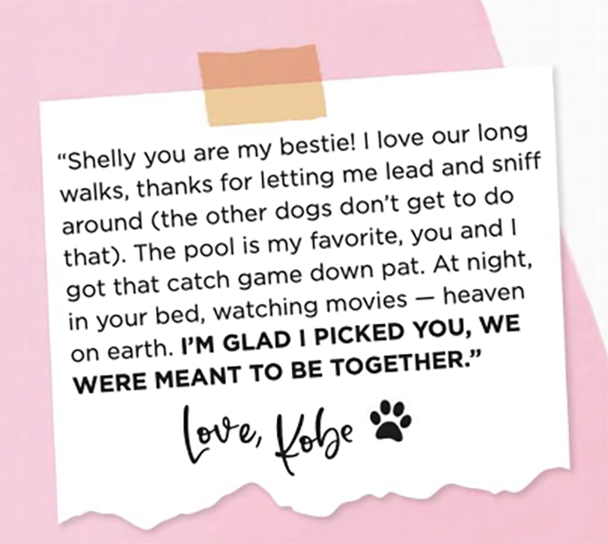 “Shelly you are my bestie! I love our long walks. Thanks for letting me lead and sniff around (the other dogs don’t get to do that). The pool is my favorite — you and I’ve got that catch game down pat. At night, in your bed, watching movies is heaven on earth. I’m glad I picked you. We were meant to be together.”