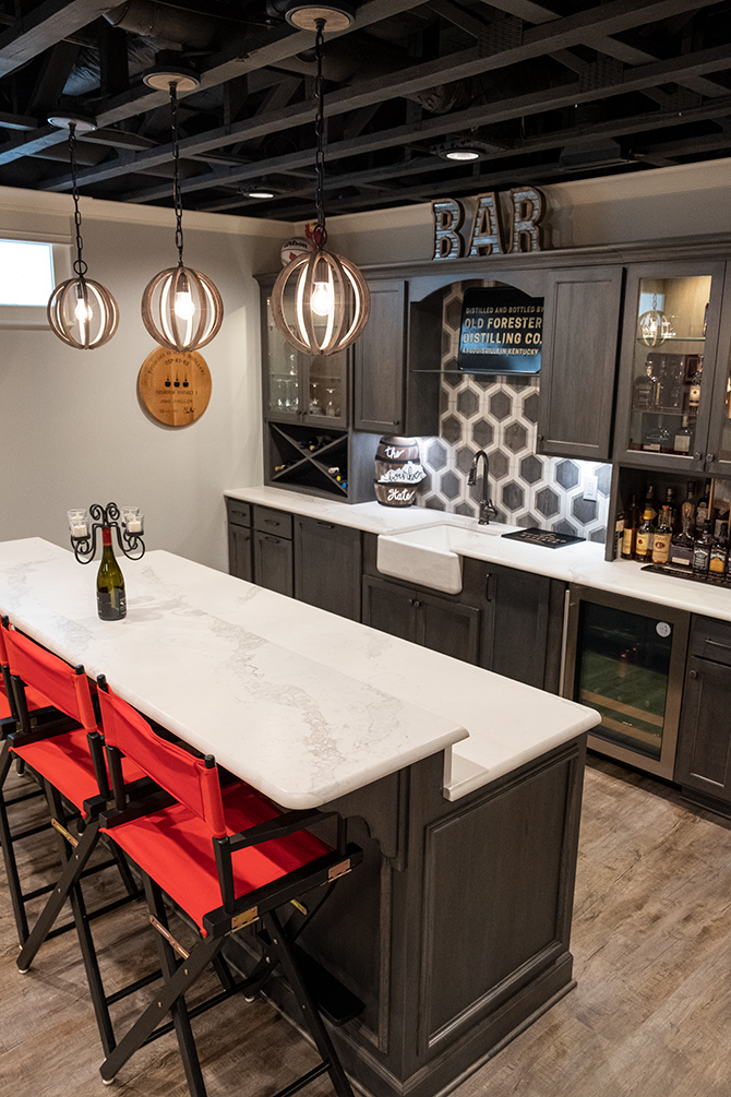 Downstairs, the University of Louisville fans added touches of Cardinal Red to the bar and game area, which sit below dark ceilings that have an unfinished look. What perhaps surprises visitors is the theatre room, with three rows of reclined seating and a treadmill for John to workout while watching the 15-foot screen. Reaching into a seemingly-normal bookcase in the entertainment room opens up into a safe room for the family.