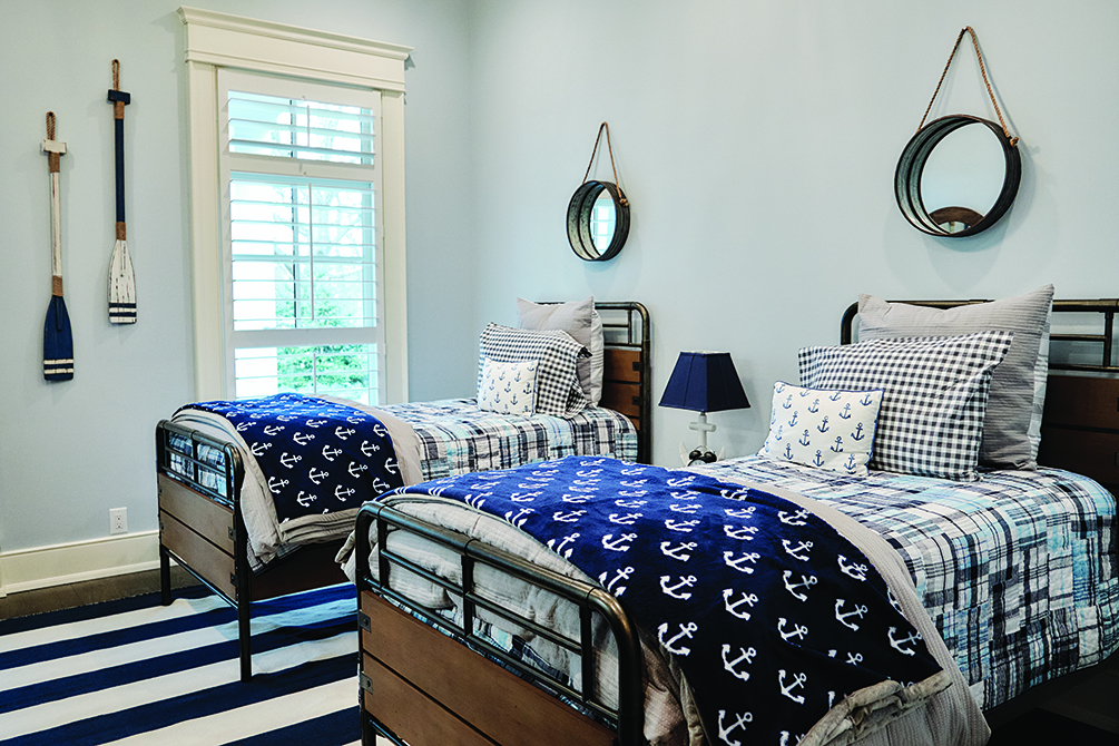 The first bedroom is used as Elaine’s office, which has Amish-made furniture, and “a lot of things she loves,” according to John, including a drawing of the couple’s first home. Two of the bedrooms are dedicated to the grandchildren, one for boys and one for girls. The girls’ room is decked out in a unicorn theme with a built-in desk and chest of toys; and the boys’ room also holds a desk and small beds and is adorned in sailboats.
