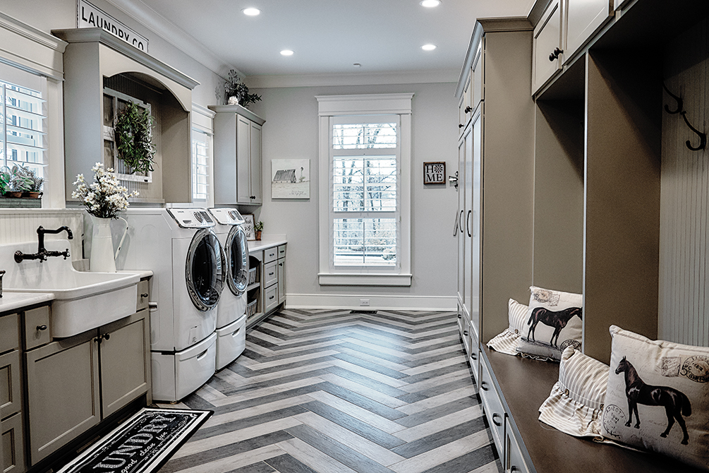 A mudroom and laundry room that would fit the whole family is located off the kitchen, with lots of storage for all of the kids. The boys and girls can hang their coats and place their shoes on shelves, all lined up together when they visit on Sundays. Even a “lost and found” cubby was added for the inevitable. A walk-in pantry in the kitchen was actually designed by John, who has a civil engineering background.