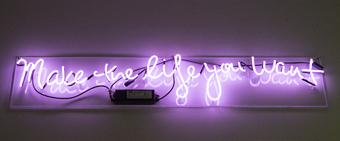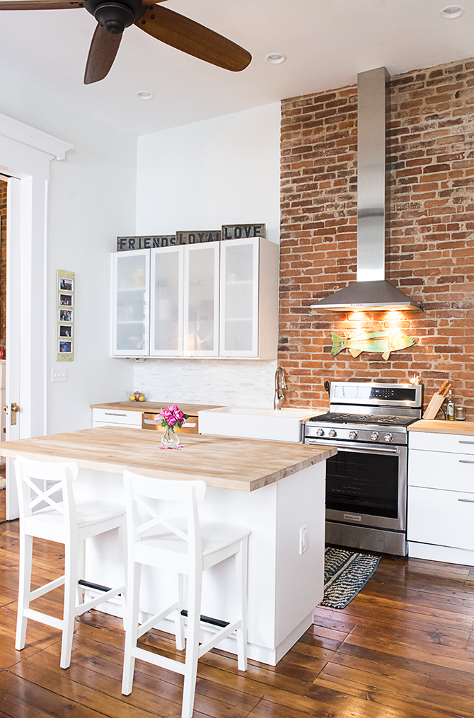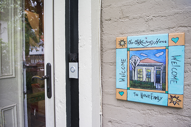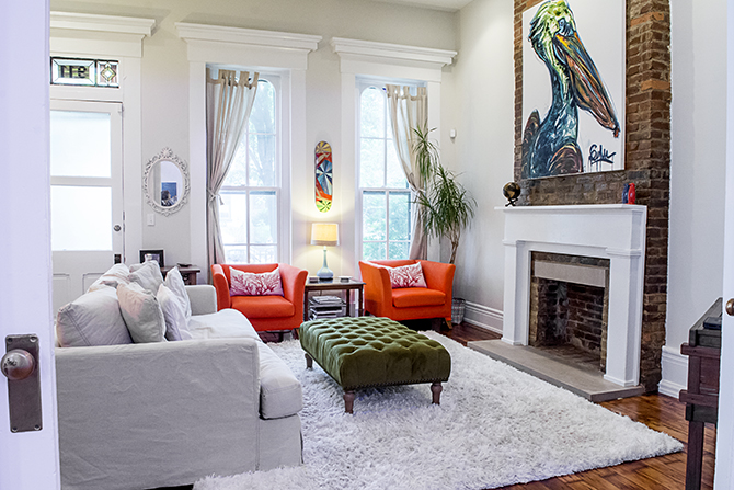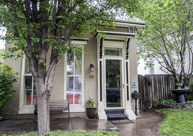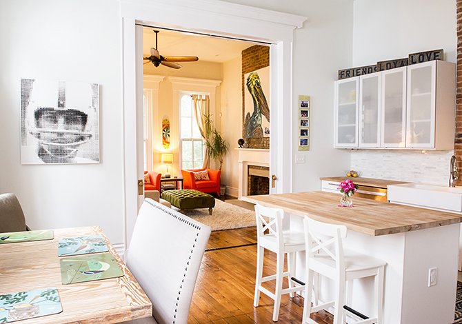 The fully restored home now features the best of both the past and present. Mo’s personal favorite is the kitchen. The combination of stainless steel appliances, wood countertops, and original brick create an eclectic but classy ambiance. She is greeted every morning by a favorite saying of hers: “Make the life you want” etched out in glowing violet letters. The home’s original pocket doors give the space flexibility. Open the doors, and the house has an open floor plan — living room and kitchen flowing seamlessly together. Close the doors and the kitchen becomes an intimate chat room.
