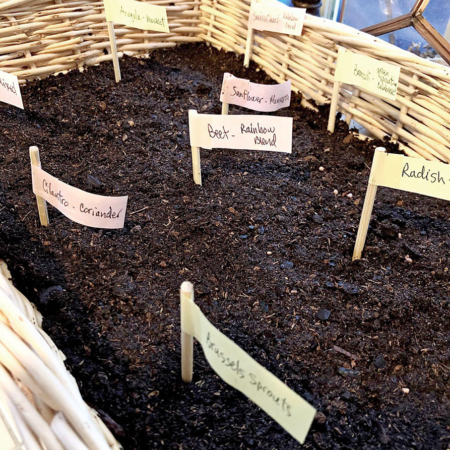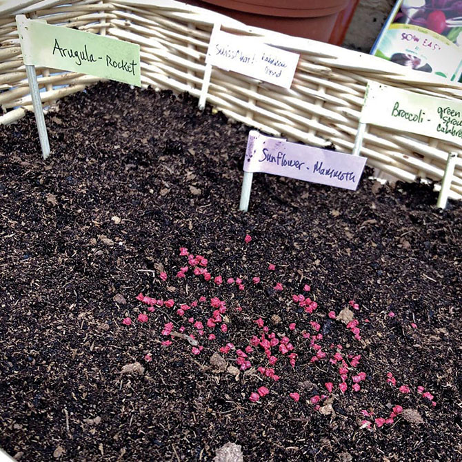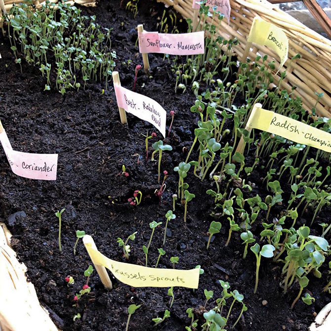 #1 I lined a wicker basket with about 2” of potting soil and planted regular seeds by sprinkling them on the top of the soil in clusters, like a small garden plot. I planted seeds of radish, arugula, beet, swiss chard, kale, basil, and cilantro, along with other greens.
