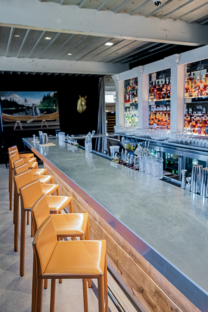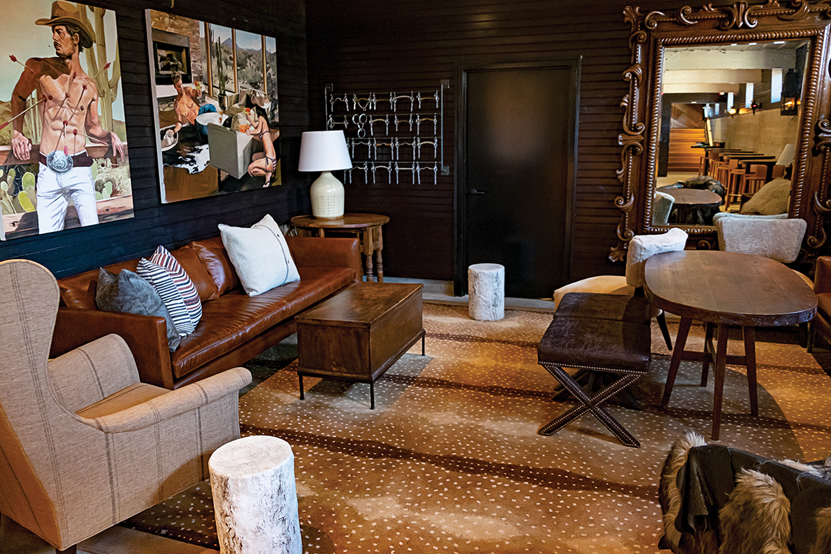 The bar showcases artwork and comfortable sitting spaces.