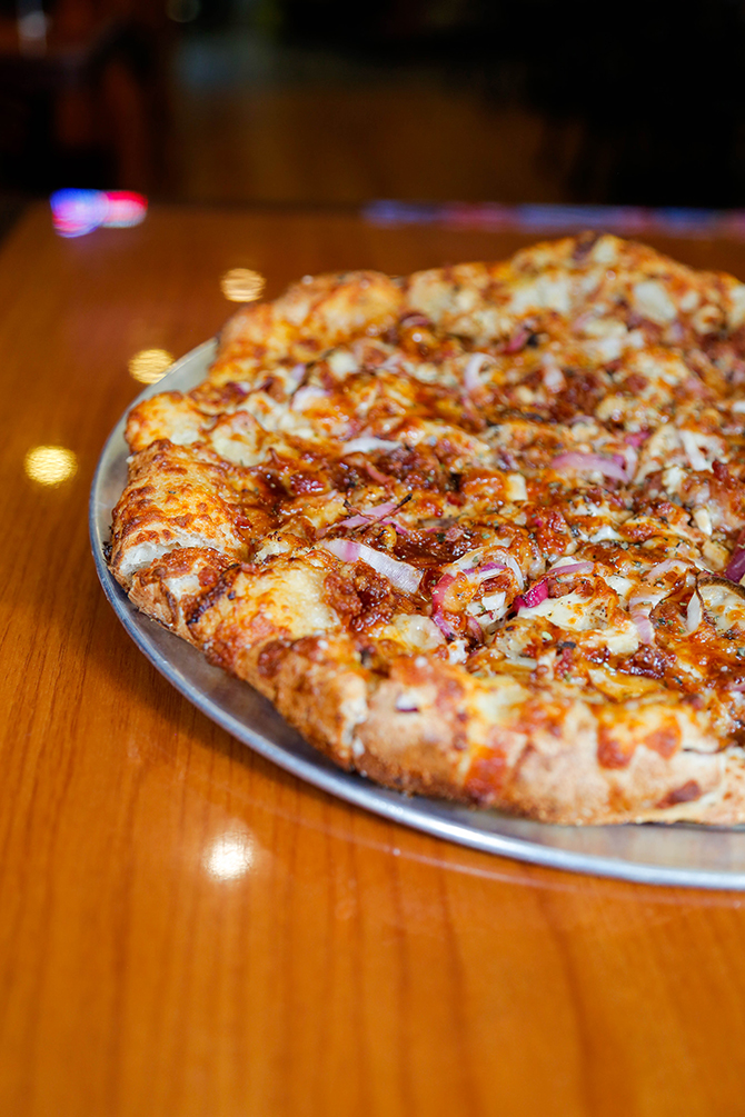 The Bourbon Pizza is made using slow-cooked homemade bourbon barbecue sauce. The sauce slow-cooks for three hours to achieve the oaky bourbon flavor. Along with the bourbon sauce, the pizza is topped with chicken, bacon, red onions, mozzarella cheese, and provolone cheese.