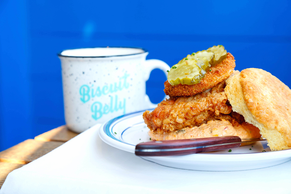 Mama’s Boy is a bisucit sandwich with buttermilk fried chicken thigh, roasted jalapeno pimento cheese, fried green tomato from Biscuit Belly. Photo by Erika Doll.