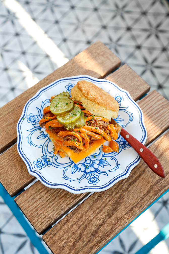 Fire In Your Belly is a biscuit sandwich with buttermilk fried chicken thigh, Nashville hot aioli, Pop’s pickles, cheddar cheese from Biscuit Belly. Photo by Erika Doll.