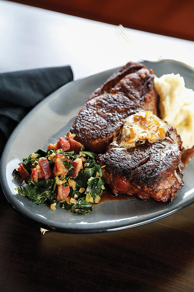 Pan-fried pork chops with southern greens, whipped potatoes, and onion gravy. Photo by Erika Doll.