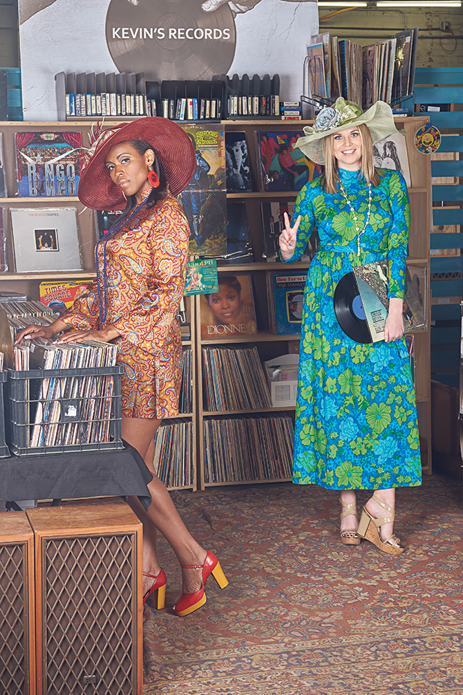 MICHELLE (left) IS WEARING: Dress, $150 from Clematis Wallace and available at Fleur de Flea Vintage Urban Market; Platform shoe, $250 from Caesar and available at Fleur de Flea Vintage Urban Market; Hat, Frank Olive Hats by Gabriel Amar, $450, available at Von Maur, Oxmoor Center.