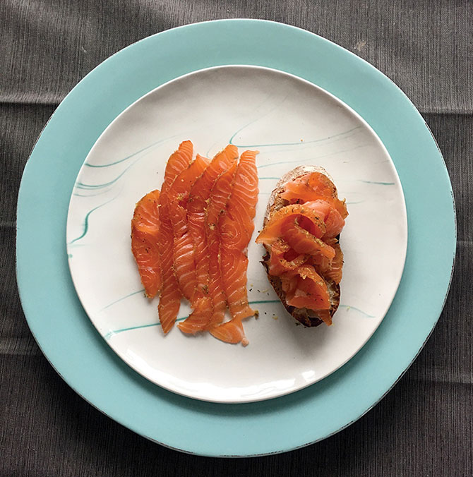 I could eat my weight in what we often refer to as smoked salmon, which is actually cured, meaning that the fish is prepared via one of a number of methods that use salt, sugar, and a nitrite to draw out moisture that would quickly cause spoilage, thereby giving your meat a longer shelf life. The science behind it is fascinating but involves talking about bacteria, and you don’t want to hear about that while you’re drooling over lox.