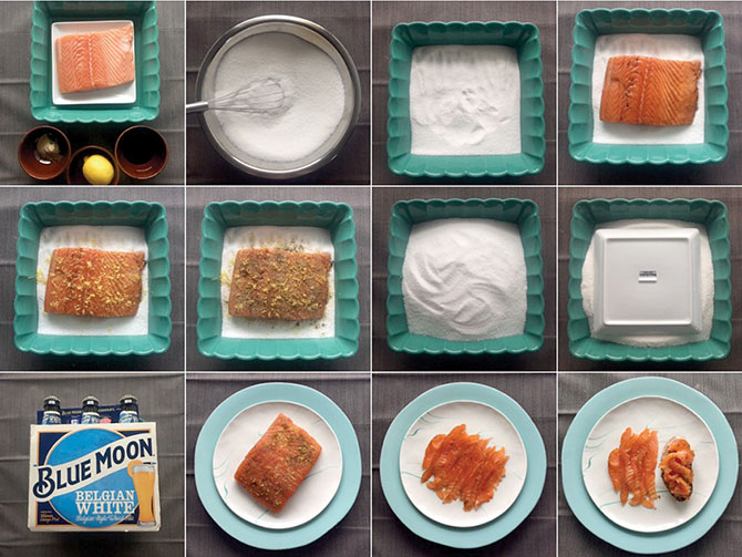 2. In a large bowl, thoroughly combine the salt and sugar. Pour 1/3 into a deep, wide container, spread it out evenly, and lay your salmon on top. Set the rest of the sugar and salt mixture aside.