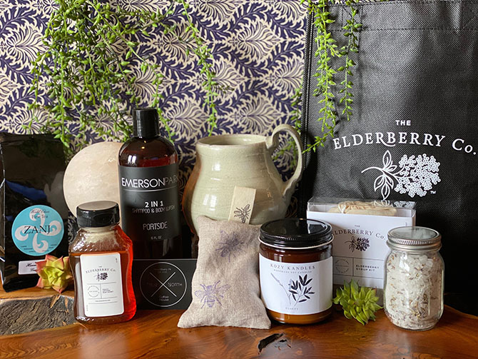• More gift items locally made by The Elderberry Co., Kozy Kandles, Emerson Park, Zanj, and Liz Dobiez