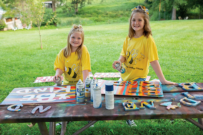 Sisters Rylyn and Raegan work at the picnic table in their backyard (the table is now a beautiful rainbow of colors thanks to their spray painting). The girls are wearing the shirts they designed for their Be Kind organization. Follow BeKindOldhamCounty on Facebook.