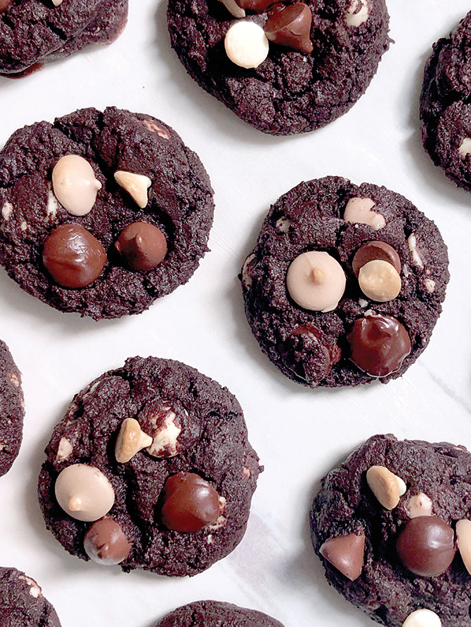 Say hello to the perfect double chocolate cookie! These are crispy on the outside, soft and chewy on the inside… simply irresistible. You can use any combination of chocolate chips that totals 12 oz. (one standard bag), but I love this “tuxedo” combination that uses 4 different types of chips, each one playing a part in a deep, dark chocolate symphony. These are fantastic! What are you waiting for?