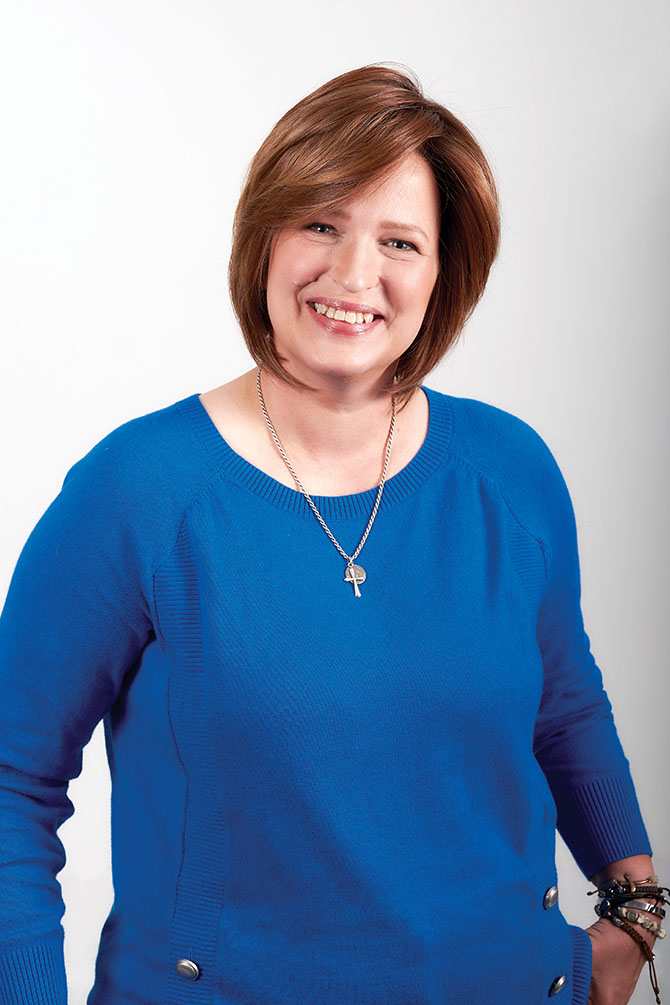 Rickelle Nelson, 50, modeled three wig styles from The Wig Shoppe and was given this wig as a gift. She is wearing a long red synthetic wig, $325 available at The Wig Shoppe, 502.412.8810. Sweater, $99; jeans, $109; scarf, $59.50 available at Talbots, 502.423.9445.