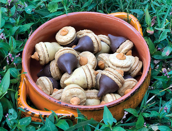 5. To create the acorns, simply use your icing to fasten Hershey’s kisses to the Nutter Butter cookies. Allow them to sit upside down for a few minutes so the icing can firm up, then pipe tiny drops of icing onto the tops and add a chocolate chip to each one.