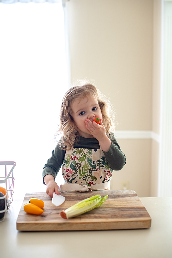 Norah prepares some veggies for her salad. Many of them go straight into her mouth instead, and that’s OK.