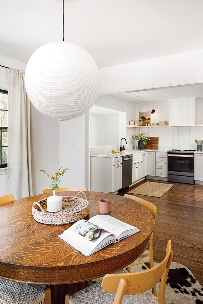 ranch-style kitchen into a modern, minimal oasis. Dani and her husband realized the need to update the heart of their home to something more functional and open — a place that could double as a hangout space, playroom, and a track for their 1-year-old to run laps in. Dani decided to keep the original square shape, but move the refrigerator to an opposing wall to free up counter space and to create a new locale for a full-wall pantry. Despite the popularity, Dani decided against the trend to include an island in order to provide enough floor space for her child’s romping. In addition, the family wanted more natural light, so they removed some columns that blocked the exterior window to let the sunshine in.