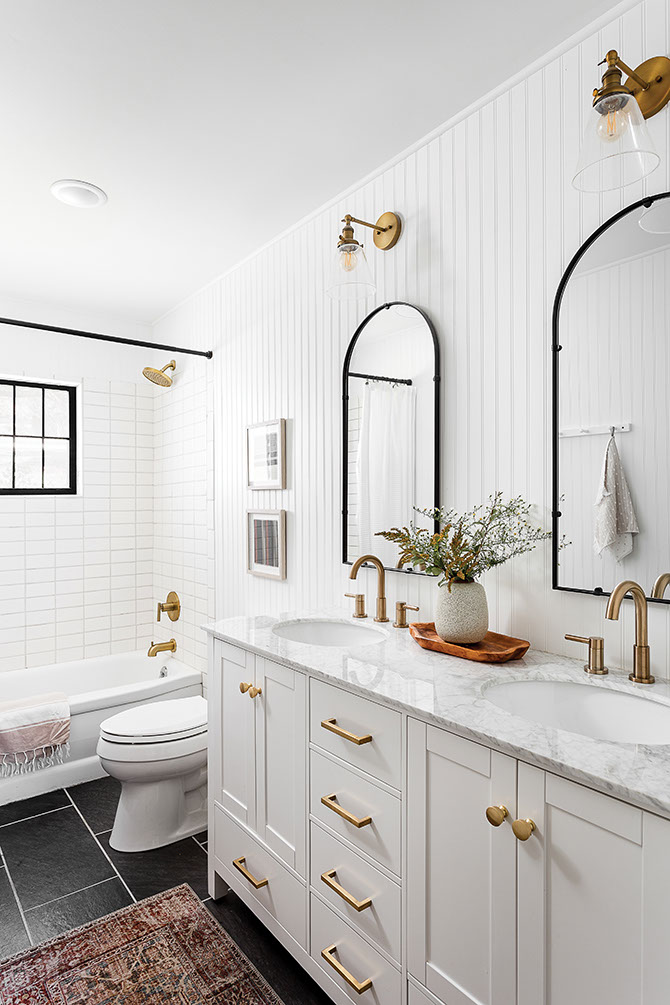 “I wanted simple and functional, white and bright,” Dani explains. In order to achieve these goals, she incorporated quartz countertops, white paint, and greige cabinets.