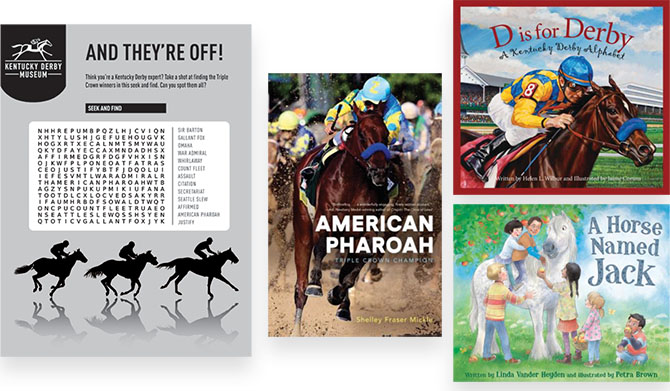 From left, a Seek & Find puzzle availabe from the Kentucky Derby Museum, and a Derby Trivia sheet, and horse-related books available at the Louisville Free Public Library: D Is for Derby: A Kentucy Derby Alphabet by Helen L. Wilbur and Illustrator Jai Corum; American Pharoah: Triple Crown Champion by Shelley Fraser Mickle; and A Horse Named Jack by Linda Vander Heyde and Illustrator Petra Brown.