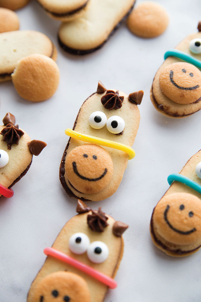 To create these horse cookies, you need Milano cookies, or any other oblong cookie with a plain shell, mini Nilla wafers, a Tootsie Roll, candy eyes, licorice strings, frosting and an edible pen. Using kitchen shears, snip a Tootsie Roll into triangle shapes for the ears, and a pastry bag and star tip can provide a tuft of horse hair.
