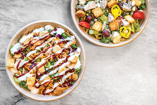 Pick up a made-to-order salad (above) from Green District with your choice of nearly 50 fresh ingredients and house-made dressings. The 502 salad includes chicken, sharp cheddar, red cabbage, carrots, grape tomatoes and jalapenos. It is topped with croutons, fried onions, ranch dressing and a barbeque drizzle. Or try their Hide and Go Greek salad with chicken, feta cheese, grape tomatoes, kalamata olives, banana peppers and red onions, topped with croutons.