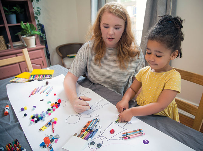 Jordan Kavuma and two-and-a-half-year-old daughter Zuri draw people on a long sheet of butcher paper.