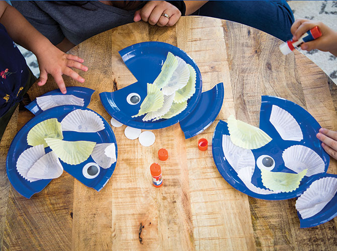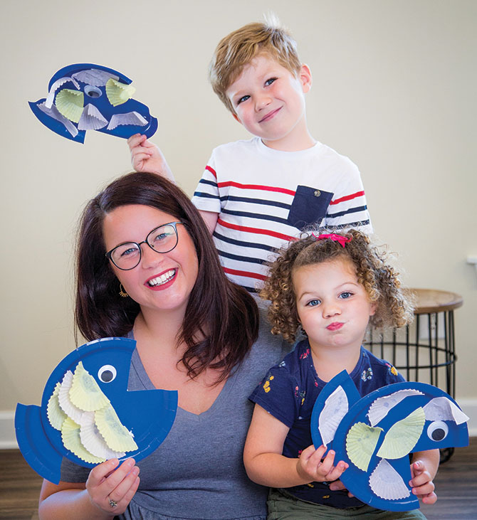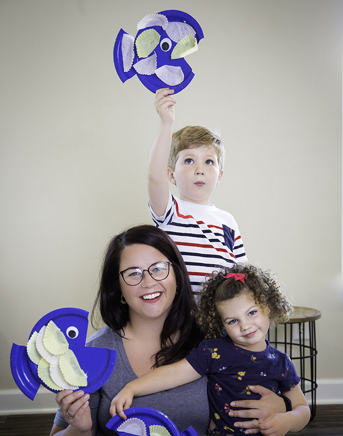 Shelly Reagan of Charlestown, Indiana, and her children Jude, 5, and Lena, 3, create fish out of paper plates, cupcake liners, and glue.