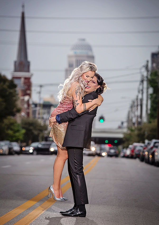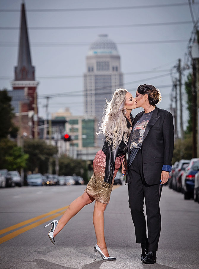 ON THE OCTOBER ISSUE COVER: Couple Barrett Gargala and Elle Becker celebrate their love — and a movement that is gaining traction. Barrett, left, is wearing: Theia sequined dress, $495, and Mitchies leather jacket, $450, both at Glasscock Too. Diamond dangle earrings, $11,900, at Davis Jewelers. Styling: Christine Fellingham | Hair and Makeup: Mikhail Schulz for J Michael’s Spa & Salon.
