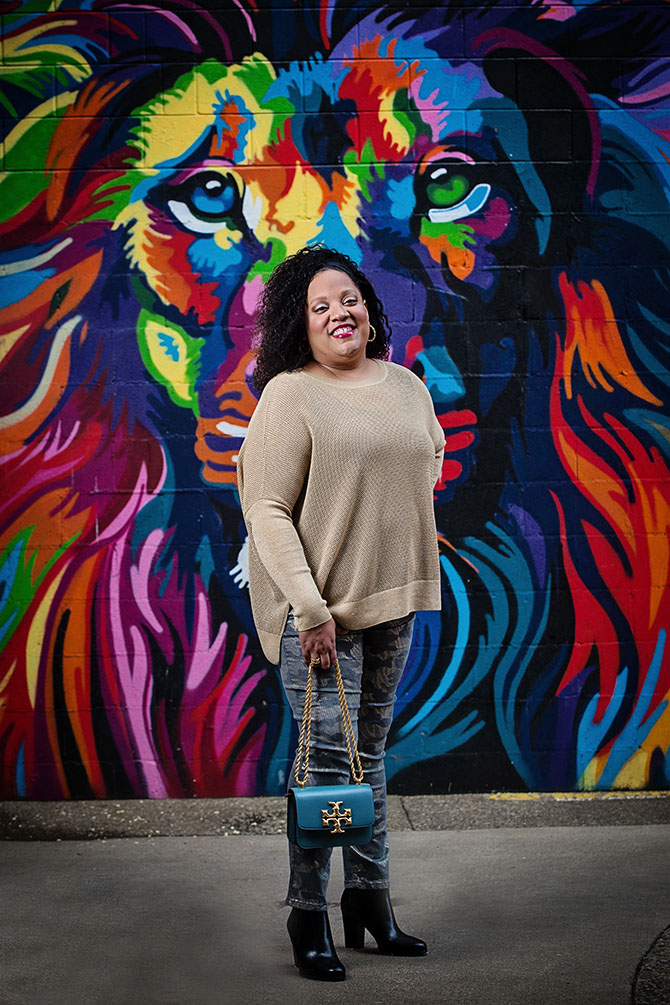 Latonia is wearing: Planet by Lauren top, $265, Frank Lyman jeans, $195, both at Glasscock Too. Tory Burch purse, $598, and Michael Kors boots, $139, at Von Maur. Judith Ripka yellow gold link hoop earrings, $3,995, and gold fashion ring, $4,495, both from Davis Jewelers. Styling: Christine Fellingham. Hair and Makeup: Kara Biery and Mariah Sanchez, J Michael’s Spa and Salon. Location: Mellwood Art Center.