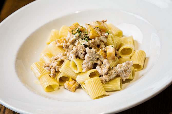 Rigatoni with butternut squash and sausage in a cream sauce.