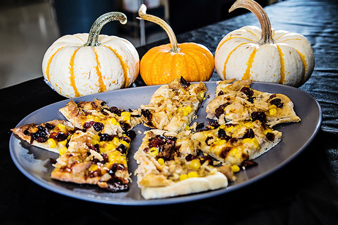 5. Next you can get your toppings together. Shred your turkey breast, and thighs, gather your cranberries, crispy onions, corn, cheese and gravy.