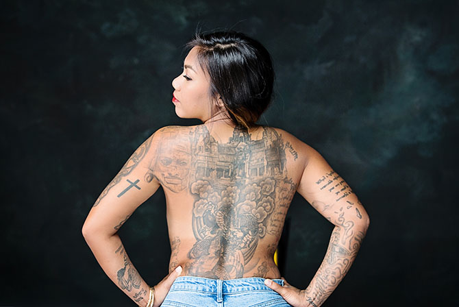 When Sopenny became a mother herself, in 2017, she found herself reflecting deeply on the struggles her first-generation refugee parents endured. A couple of years prior, her family reconnected with the long-lost siblings they left behind — family they assumed to be dead. So, while breastfeeding a new baby and nurturing her new identity as a mother, Sopenny decided to honor her heritage by tattooing the Angkor Wat across her back. Despite the destruction of the Khmer Rouge, the Angkor Wat temple, the largest religious temple complex in the world, symbolizes the strength and splendor of her parents’ homeland. Alongside the temple, Sopenny also chose to include an Apsara Dancer, the iconic Hindu symbol of femininity and grace sewn into traditional Cambodian dress, which represents the sister Sopenny found a few summers prior.